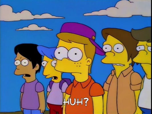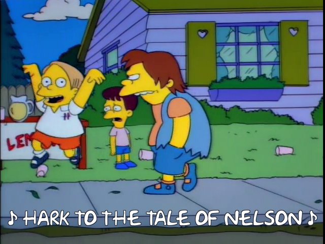 I would see this same boy again at times over the next several years, and I always quietly wondered if he (or any of the Twinsburg other boys) were able to tell us apart or cared enough to remember us from one encounter to the next. There’s a season 6 episode of the Simpsons called “Lemon of Troy” where the boys of Springfield were engaged in a bitter battle with the boys of the bordering town, Shelbyville. The boys in Shelbyville (Twinsburg) are bigger, badder, dumber, and more homely than the boys in Springfield (Aurora), and I’ve always told Mary Alice that this is a mirror image of what it was like. In the still frame here, Bart has just triumphantly reveals to a Shelbyville boy (who is basically the Shelbyville version of him) among some other townies that he’s “Bart Simpson,” which draws blank stares from the group. It’s only after he tells them he’s from Springfield that they want to beat him up, and I always suspected the Twinsburg boys were the same kind of self-absorbed toughs who didn’t know or remember us from anyone else, they only knew to be physically aggressive once they realized we were from the other block up the hill.